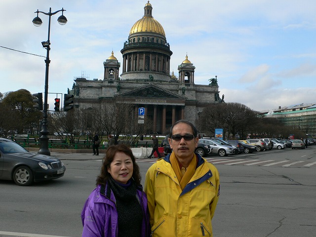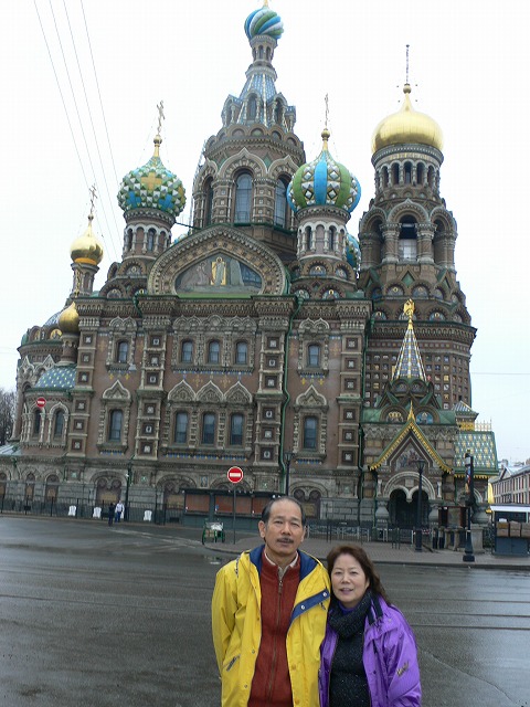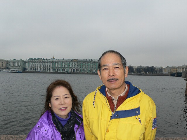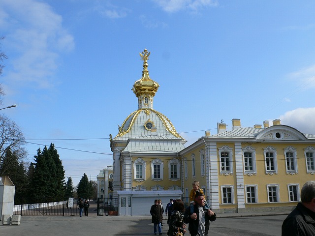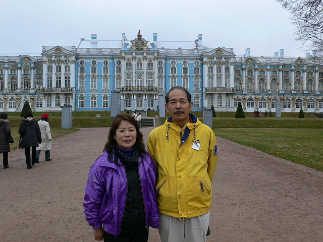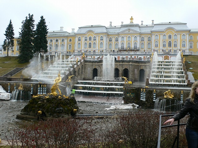 3.ピョートル大帝夏の宮殿の庭園 サンクトペテルブルクの西、約27キロにある。 ピョートル大帝がスウェーデンとの北方戦争勝利を記念して建てた離宮。庭園内には、たくさん(約150)の噴水が点在している。全長22キロに及ぶ配水管で、ポンプを使わず全て自然の傾斜を利用した噴水となっている。 宮殿内に博物館があったが、撮影禁止だった。博物館前でロシア人と一緒に写真を撮った。 |