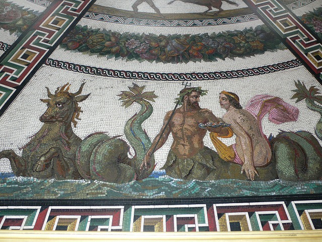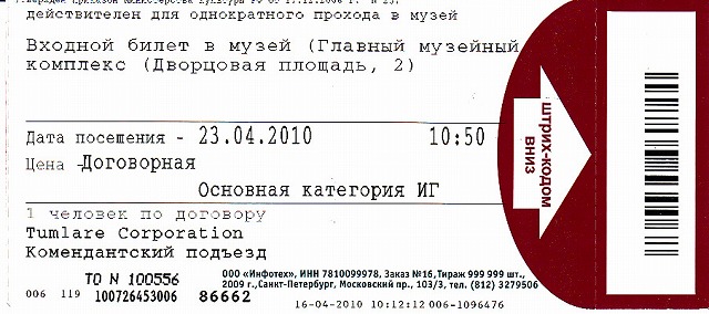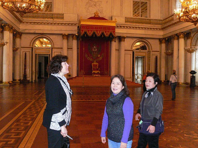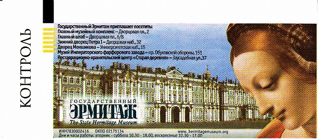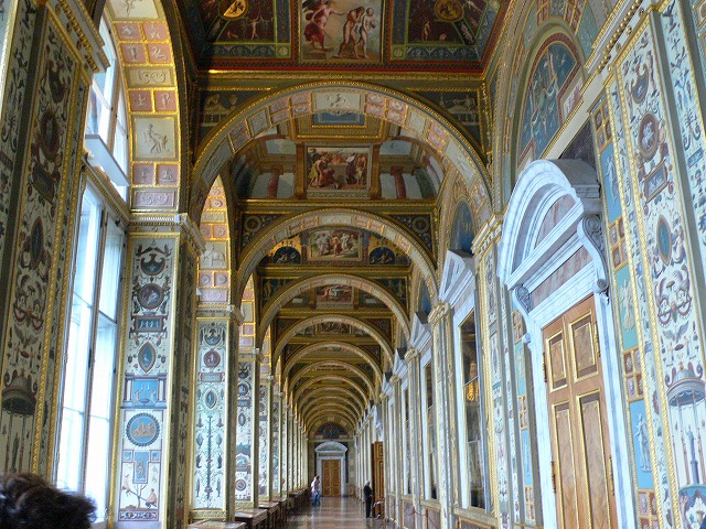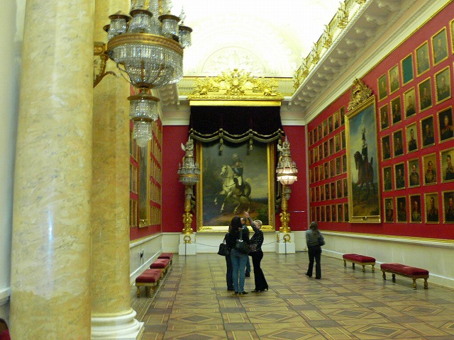 1.エルミタージュ美術館 【世界遺産】 チケット(表、裏) ロシアの国立美術館。 1990年に世界遺産(サンクトペテルブルク歴史地区と関連建造物群)に包括登録されている。小エルミタージュ、旧エルミタージュ、新エルミタージュ、エルミタージュ劇場、冬宮の5つの建物が一体となって構成されており、現在本館となっている冬宮はロマノフ朝時代の王宮である。 1764年にエカテェリーナ2世がドイツから美術品を買い取ったのが、エルミタージュ・コレクションのはじまりである。 1917年のロシア革命後は貴族から没収されたコレクションの集積所となった。1918年には冬宮に存在したすべての研究、管理組織を建物ともどもエルミタージュ美術館として統合することが決定され、この統合作業は第二次大戦後に完了した。 (1)小玉座の間(The Small Throne Room) 小玉座の間はピョートル大帝にちなんでつくられたため、ピョートルの間とも呼ばれており、もともと、謁見のために用いられた部屋。 (2)大玉座の間 このホールは小玉座の間と比較され、大玉座(The St. George Hall )の間と呼ばれている。壁はイタリアから特別に輸入した、カララ産の白い大理石がふんだんに用いられており、床はカラフルな寄木細工で、その模様と同じものが天井にも銅版で作られている。 (3)パヴィリオンの間 床は古代ローマのモザイク画が施されている。す (4)孔雀石の花瓶 光沢のある緑色の孔雀石(マラカイト)の花瓶。 皿などの装飾品もたくさんあった。 各展示室は立派で、通路もゴージャスです。 |