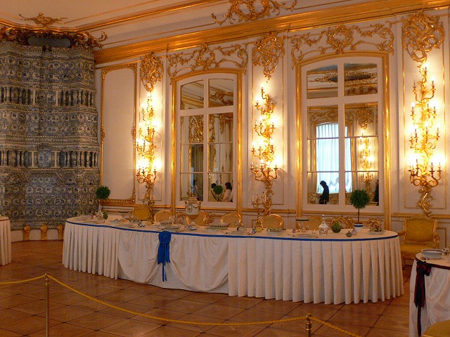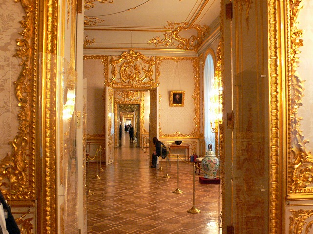 2.エカテリーナ宮殿 【世界遺産】 サンクトペテルブルク中心部から南東25kmの郊外プーシキン市の避暑地ツァールスコエ・セローにあるロシア帝国時代のロココ建築の宮殿。エルミタージュの冬の宮殿に対して、夏の宮殿と呼ばれている。 宮殿の名前は、ピョートル大帝の后でもあった、第2代ロシア皇帝エカテリーナ1世に由来する。エカテリーナがドイツの建築家Johann-Friedrich Braunsteinを雇って夏の避暑用の離宮として1717年に作らせたのが最初のもので、その後、第4代ロシア皇帝アンナがロシア人建築家に命じて増築させた。第6代ロシア皇帝となったエリザヴェータは母のエカテリーナが建築させたものが時代遅れで不便であるとして抜本的に作り直すことを決定、壮麗・壮大なロココ調建築に入れ替えるよう、既に冬宮殿建設に関わっていた宮廷付き建築家バルトロメオ・ラストレッリに命じた。建設は1752年から4年の歳月をついやし、1756年に全長325メートルの現行規模の宮殿が完成した。 琥珀の間が有名。琥珀は、第二次世界大戦のレニングラード包囲戦中にドイツ軍に持ち去られたが、1979年から始まった復元作業により、2003年に完全に復元された。 1791年、日本人の漂流民大黒屋光太夫が帰国を願うため、エカテリーナ2世に謁見した場所としても知られる。 各部屋は絢爛豪華で、調度品(1,2,3)、壁の絵(1,2,3)、寄木作りの床など素晴らしかった。寒いロシアらしく、多くの部屋にペチカがあった。ペチカはオランダのデルフト焼きだそうだ。 |