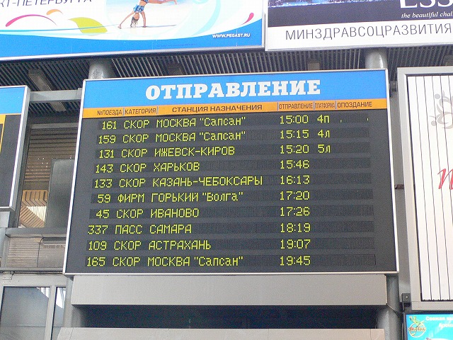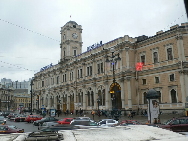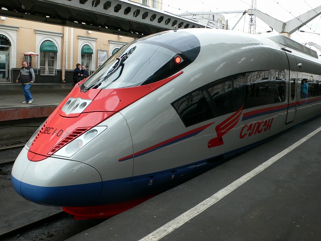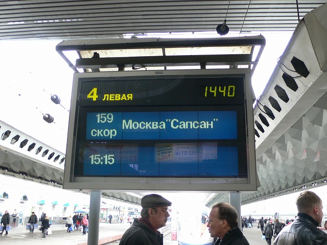 3.鉄道 特急列車で、サンクトペテルブルクからモスクワへ移動した。 サンクトペテルブルクには主な駅が5つあり、モスクワに行くにはモスクワ駅から乗車する。目的地が駅名になっているのは面白いが、駅が相互乗り入れしていないのは、不便だと思う。 駅構内はこんな感じ、路線図や時刻表があった。 15:15発の新型車両『サプサン』(ハヤブサの意)でモスクワに向かった。車両中央の席にはテーブルが付いていた。中央部の車両にはカフェがあり、コーヒーを飲んだ。 約4時間でモスクワのレニングラード駅に到着した。 |